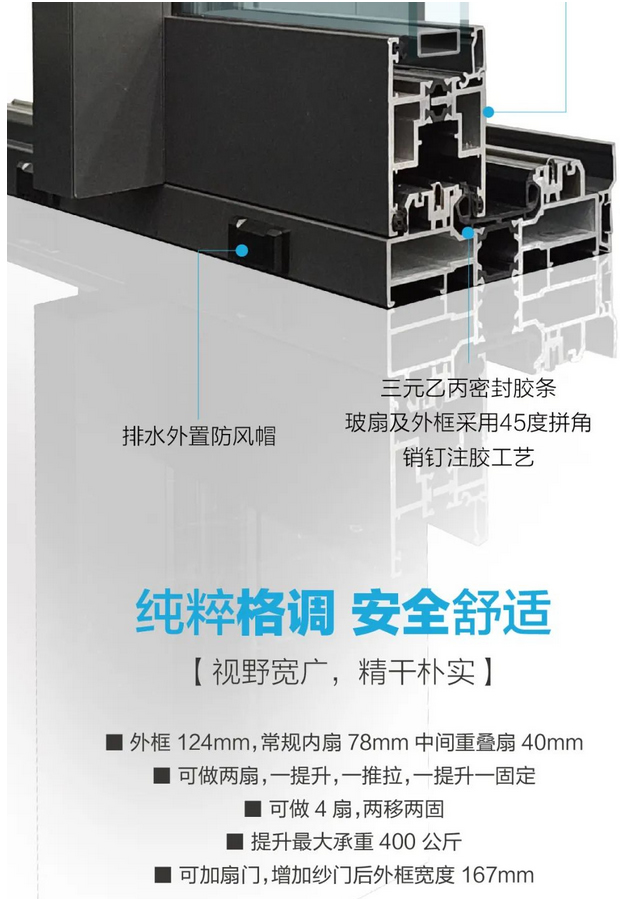 型材厚大宁静温馨:虽然型材宽度窄但型材的壁厚比通俗推拉门要厚保障了门扇框的强度。大气雅观的同时,不忘增添型材的刚度增添宁静机能。