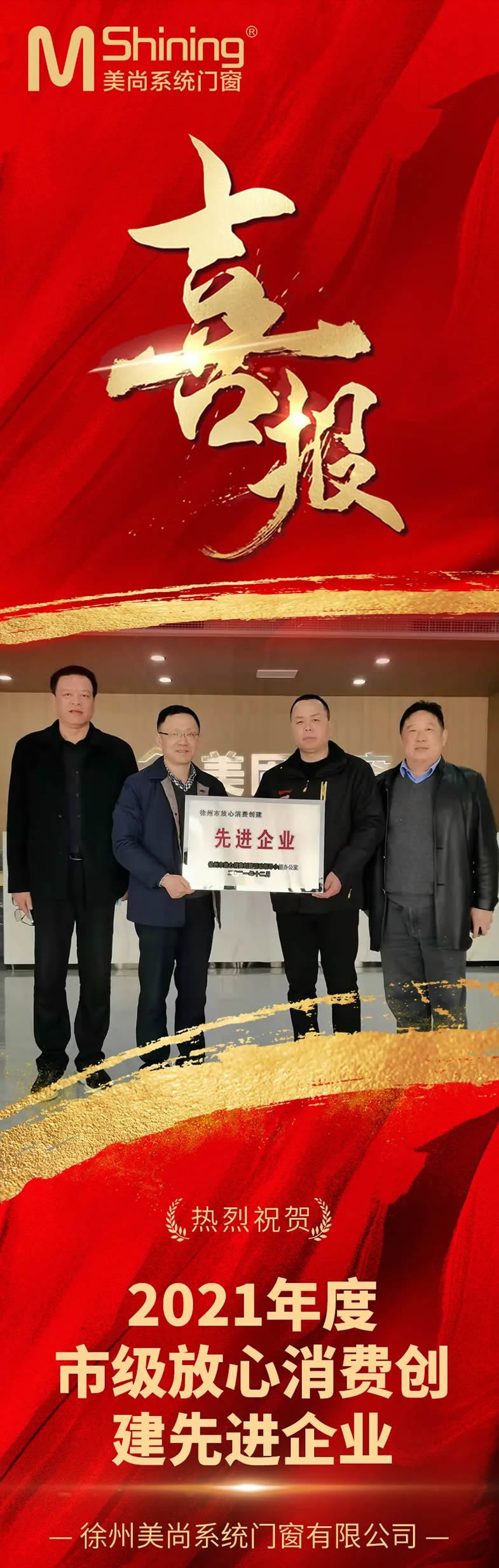 门窗十大品牌美尚门窗喜信丨我司荣获“2021年度市级安心花费建立进步前辈企业”