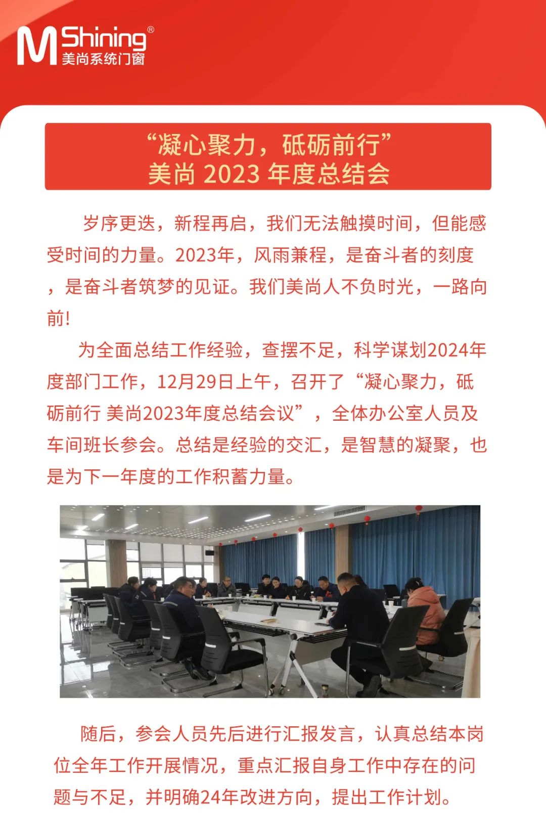 为周全总结任务经历,查摆缺乏,迷信经营2024年度部分任务,12月29日上午,召开了“凝心聚力,砥砺前行 美尚2023年度总结集会”,全部办公室职员及车间班长参会。总结是经历的交汇,是聪明的凝集,也是为下一年度的任务积储气力。